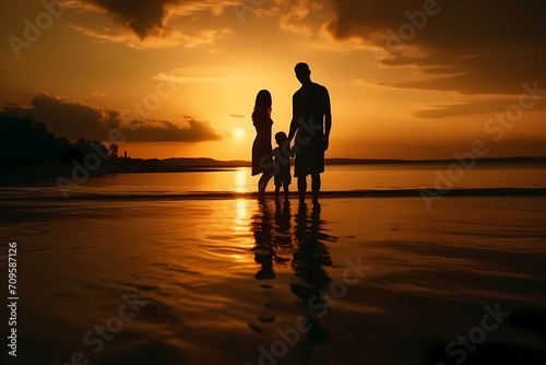Silhouette Of Happy Family Together, A Group Of People Standing On A Beach