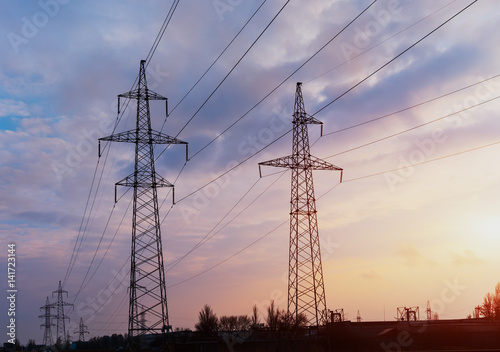 Silhouette of high voltage electrical pole. Sunset sky background.