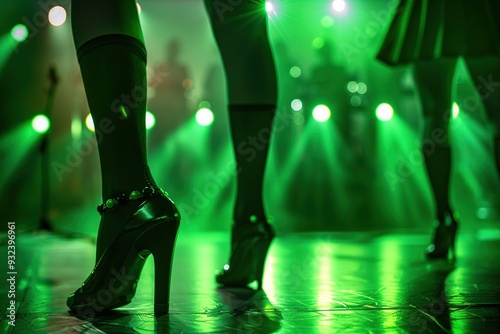 Silhouette of high-heeled shoes on stage with green lighting during a performance.