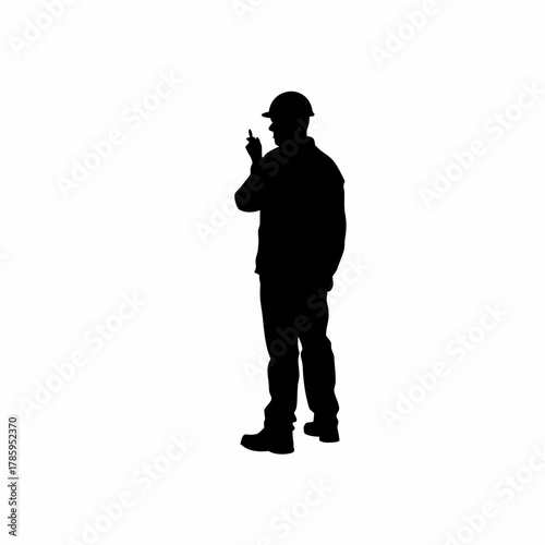 Silhouette of inspector observing welding sparks from safe zone isolated on white background