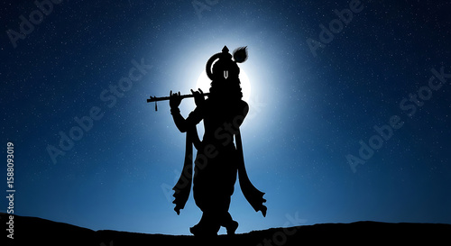 krishna, indian, hindu, god, flute, silhouette, night, sky, star, moon, blue, dark, spiritual, religion, deity, illustration, vector, graphic, art, festival, celebration, music, playing, pose, standing, traditional, culture, worship, faith, belief, devotional, peaceful, serene, background, design, artwork, symbol, icon, black, white