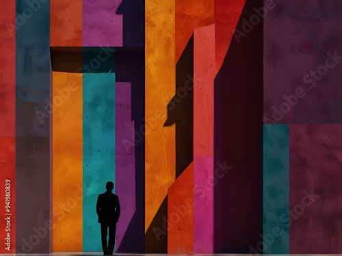 man, silhouette, wall, colourful, abstract, modern, architecture, design, urban, city, geometric, stripes, pattern, shape, shadow, light, contrast, style, trend, contemporary, background, texture, creative, art, graphic, minimalism, simple, bold, vibrant, bright, colours, grunge, industrial, minimalist, graphic design, modern art, abstract art