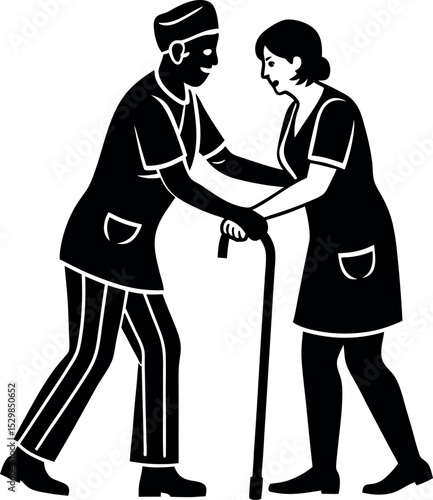 nurse, helping, elderly, patient, care, health, medicals, hospital, doctor, assistance, aid, senior, old, people, medicine, health care, professional, men at work, clinic, staff, service, compassion, kindness, human, white, background, silhouette, black, figure, outline, vector, illustration, graphic, design, art, icon, image, picture, drawing, simple, minimal, modern, clean, concept, symbol