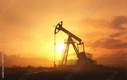 silhouette, oil, pump, sunset, sunrise, horizon, landscape, machinery, industry, energy, production, pumping, field, dusk, gold, orange, warm, light, dark, silhouette, machine, rural, industrial, equipment, exterior, nature, sky, cloud, golden hour, vibrant, colours, misty, foggy, still, image, dramatic, atmosphere, warmth