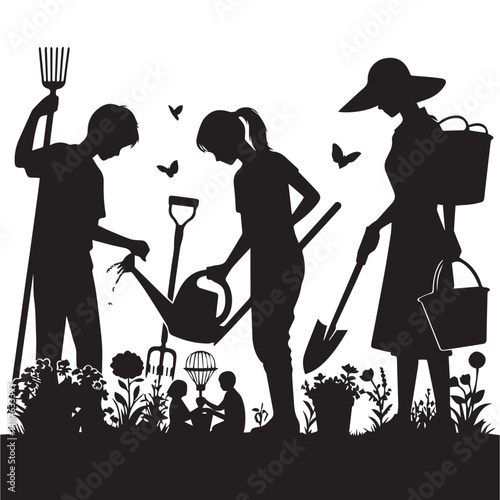 silhouette of people gardening, editable vector image