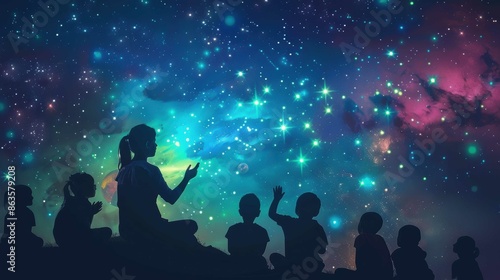 Silhouette of people under a vibrant night sky filled with stars, creating a magical and inspirational scene of stargazing and wonder.