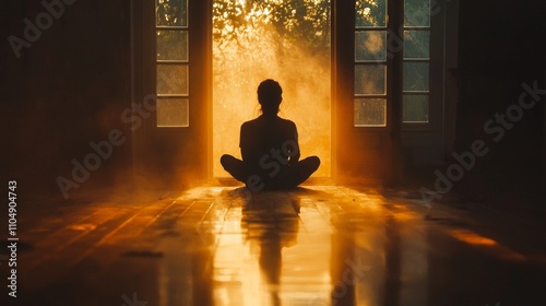 Silhouette of person in window frame with warm light
