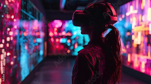 person, silhouette, headset, digital, art, gallery, vibrant, colours, neon, light, technology, future, life events, virtual, reality, modern, space, glowing, wall, display, panel, colourful, lightshow, experiencing, interactive, displaying, exhibition, background, scene, light, dark, head, profile, woman, looking, attentive, immersed, futuristic, design