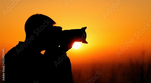 Silhouette of photographer taking pictures at golden sunset or sunrise