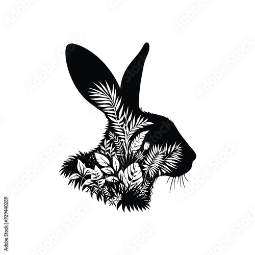 silhouette of Rabbit, filled with tropical plant in the jungle in rough drawing,