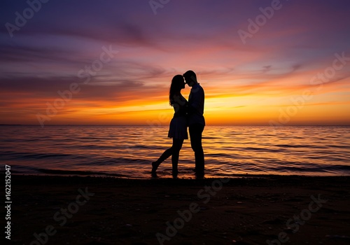 silhouette of romantic lovers hug with sea ocean with sunset. Generative AI