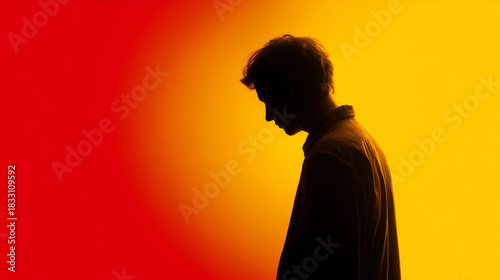 Silhouette of sad man in profile against vibrant red orange yellow gradient background. Depression, stress, loneliness and mental health concept with dramatic warm lighting and contemplative mood.