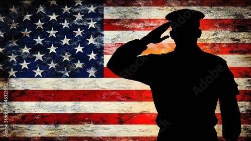 Silhouette of soldier saluting American flag. A dark silhouette of a soldier salutes the American flag, set against a distressed, textured rendition of the flag