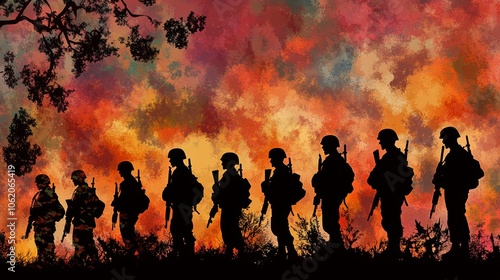 Silhouette of Soldiers in Combat Zone with Sunset Sky
