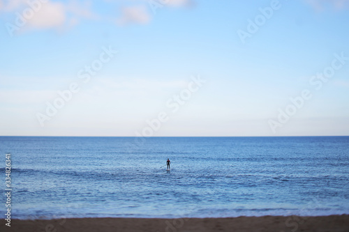 Silhouette of surfer from back on the blackboard in calm sea. Recreation and sports. Barcelona, Spain