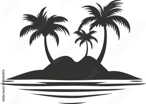 island, palm, tree, silhouette, tropical, beach, ocean, sea, nature, vacation, sunset, paradise, exotic, landscape, illustration, graphic, summer, holiday, coastal, seascape