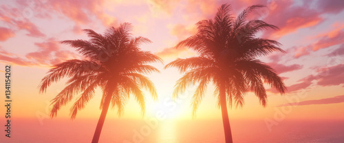 Silhouette of two palm trees at sunset over ocean, warm orange and pink hues, evokes tropical vacation, paradise, relaxation
