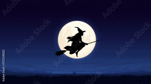 Silhouette of witch flying on broomstick against full moon creates magical and enchanting atmosphere. night sky is filled with stars, enhancing mystical scene