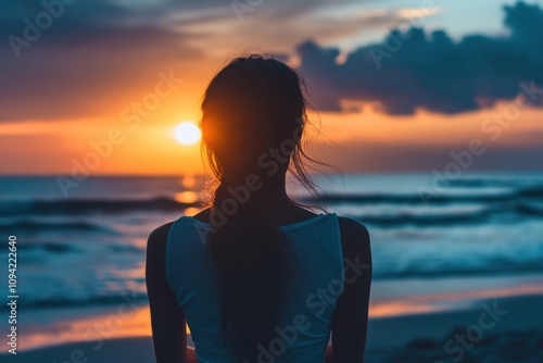 Silhouette of woman facing sunset. Perfect for themes of peace, solitude, or relaxation by the sea.