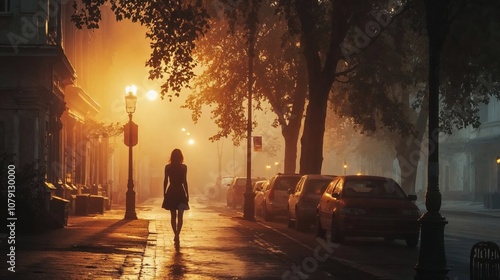 Silhouette of woman in dress walking alone on misty street at sunset, with golden light filtering through trees and illuminating wet pavement alongside parked cars