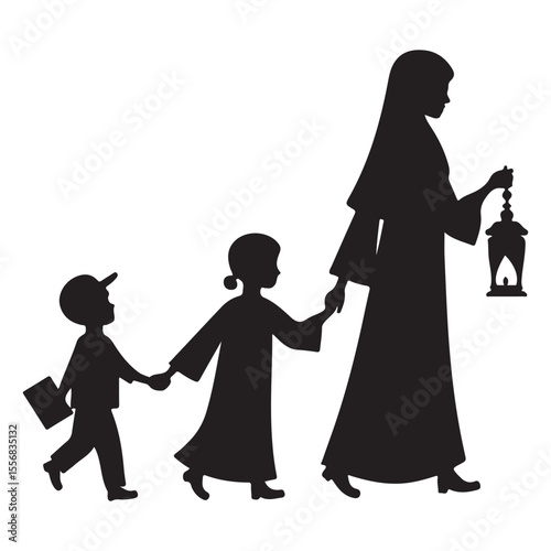silhouette, woman, children, lantern, guide, walking, family, mother, children, leader, night, light, care, journey, protection, teacher, school, path, holding, parenting, trust, love, motherhood, nurture, caring, vector, clip art, shadow, black, white, outline, traditional, dress, book, education, female, vintage, guardian, follower, together, safety, support, warmth, direction, oneness, helping, faith