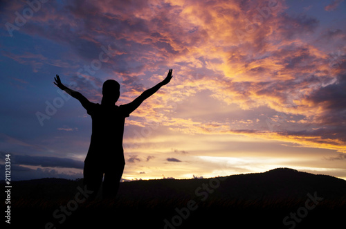Silhouette of woman praying over beautiful sky background