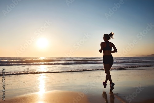 silhouette of woman running on sea beach with sunrise, healthy lifestyle