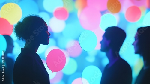 silhouette, woman, colourful, bokeh, background, speech, bubble, communication, interaction, diversity, people, nightlife, celebration, abstract, portrait, female, vibrant, glow, light, expression, conversation, imagination, creativity, mood, emotion, artistic, digital, design, modern, illustration, ambient, visual, concept, scenery, scene, party, youth, social, engagement, culture, friendship, gathering, atmosphere, inspiration, enjoyment, entertainment, fun, decor