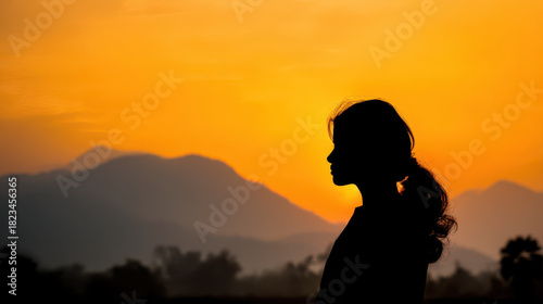 Silhouette of woman with ponytail is set against vibrant orange sunset, with mountains in background creating serene and peaceful atmosphere