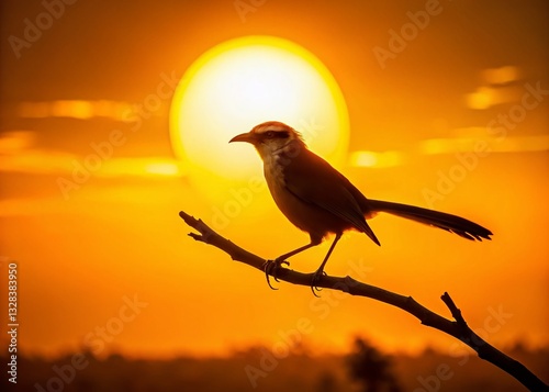 Silhouette of Yellow-Eyed Babbler Bird at Sunset, Wildlife Photography