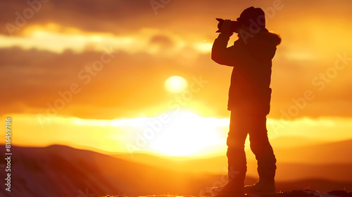 Silhouette of young photographer at sunset sunrise in Iceland : Generative AI