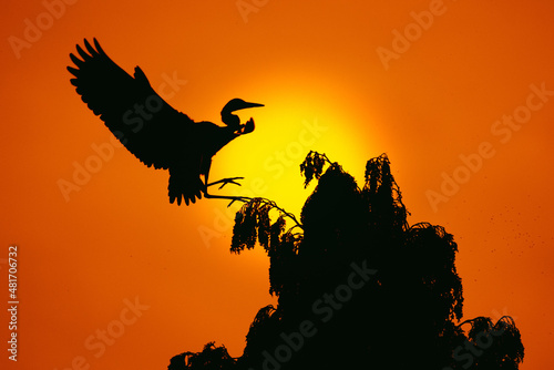 Silhouette oiseau en vol coucher de soleil
