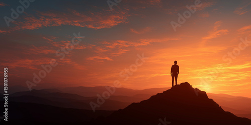 silhouette, person, sunset, mountain, sky, orange, dramatic, scene, horizon, landscape, nature, peak, light, shadow, solitude, scenic, climb, view, backlit, travel, outdoors, hiker, peaceful, adventure, evening, cloud