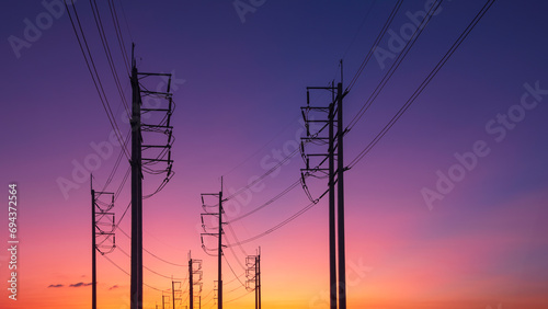 Silhouette row of electric power poles with cable lines against colorful dramatic twilight sky background, low angle and perspective side view