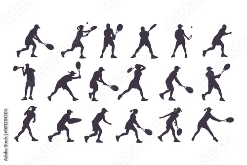 Silhouette Set of Tennis Players in Various Action Poses, Collection of Sporty Men and Women Playing Tennis, Vector Illustration