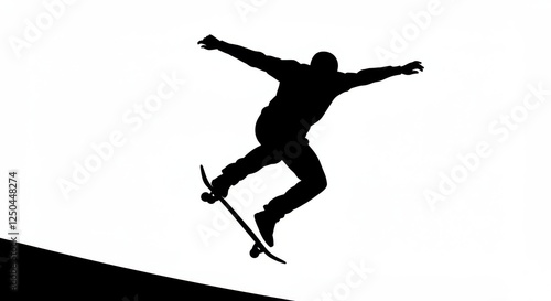 Silhouette, skateboarder, action pose, dynamic movement, mid-trick, urban sport, black and white, high contrast, graphic design style, minimalist, street culture