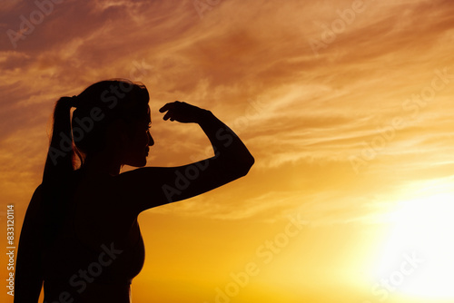 Silhouette, thinking and girl by sunset outdoor for vacation, holiday and adventure in Puerto Rico. Scenic view, travel and woman by orange sky for peace, relax and ideas in nature for wellness