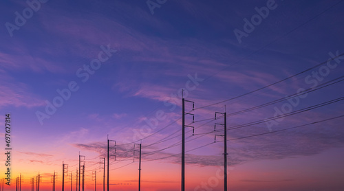 silhouette, electric, pole, cable, twilight, colourful, sky, evening, row, electrical, background, countryside, sunset, light, many-coloured, utility, orange, line, widescreen, sunrise, power, blue, cloud, purple, scenery, night, perspective, scenic, energy, facility, connection, development, copy space, voltage, structure, pylon, equipment, technology, construction