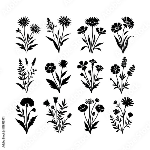 wildflower, silhouette, vector, logotype, set, daisy, cornflower, poppy, bluebell, buttercup, black, white, background, simple, flat, design, flower, floral, nature, plant, meadow, field, spring, summer, botanical, illustration, drawing, outline, icon, symbol, garden, wild, blossom, stem, leaf, natural, elegant, minimal, monochrome, graphic, decorative, artistic, organic, eco, environment, beauty, bloom