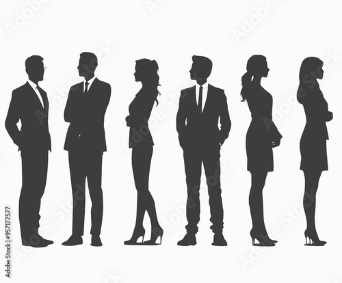 silhouette, businessman, businesswoman, diverse, vector, line, standing, people, different, body, type, group, diversity, professional, team, corporate, oneness, together, office, figure, queue, manpower, colleague, collaboration, side, profile, contrast, minimal, elegant, simple, illustration, shadow, outline, business, employee, human, abstract, isolated, pose, alignment, formal, occupation, variation, sex, inclusion, uniform, composition, artwork