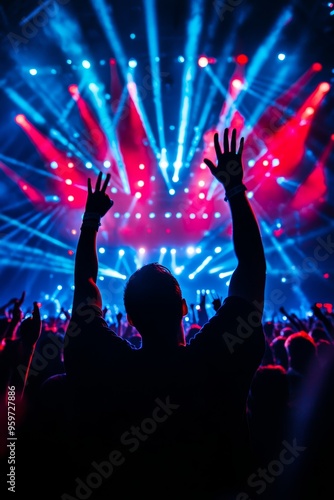Silhouetted audience cheering as vibrant lights burst across the stage, creating a dynamic and immersive concert experience