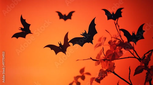 Silhouetted Bats Flying Against a Vibrant Orange Background