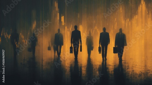 Silhouetted business people walk with briefcases against a blurred golden background.