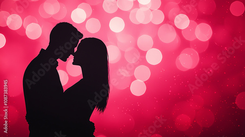 Silhouetted couple embracing against sparkling red background, perfect for Valentine Day. romantic atmosphere evokes love and connection