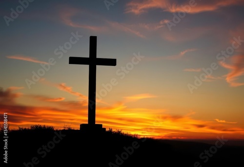 Silhouetted cross atop hill, fiery sunset sky, religion, God