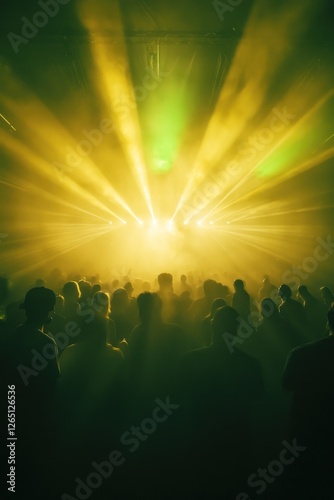concert, crowd, music, festival, light, stage, performance, show, event, party, people, silhouette, darkness, energy, atmosphere, night, entertainment, audience, spotlight, ray, yellow, green, glow, illumination, vibrant, bright, dynamic, exciting, powerful, intense, hazy, smoke, fog, abstract, background, texture, design, graphic, image, photo, picture, visual