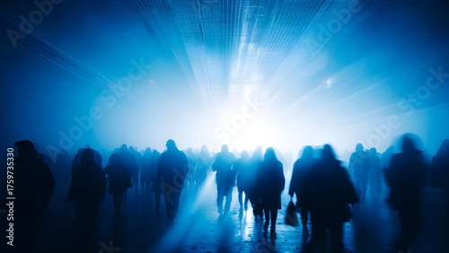 Silhouetted crowd in a blue, foggy indoor space moving toward a bright white light at the center. Concept Silhouetted crowd in a blue foggy indoor space moving toward a bright central light