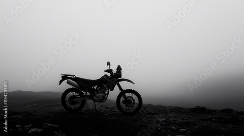motorcycle, motorbike, adventure, fog, mist, mountain, hill, landscape, outdoors, travel, journey, exploration, freedom, solitude, scenic, view, nature, wilderness, terrain, road, path, offroad, wheel, tire, black, white, monochrome, silhouette, shadow, vehicle, transportation, engine, power, speed, ride, driver, rider, helmet, extreme, sport, dirt, gravel, rocky, sky, cloud, grey
