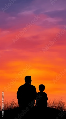 Silhouetted Father and Son Enjoying a Sunset on Hilltop Nature Scene Tranquil Environment Emotional Bond