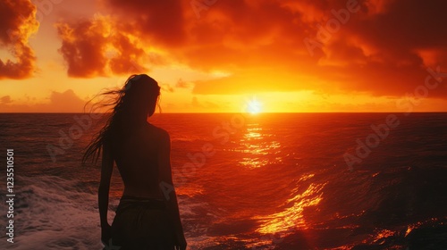 Silhouetted figure contemplates fiery sunset over the vast expanse of the ocean